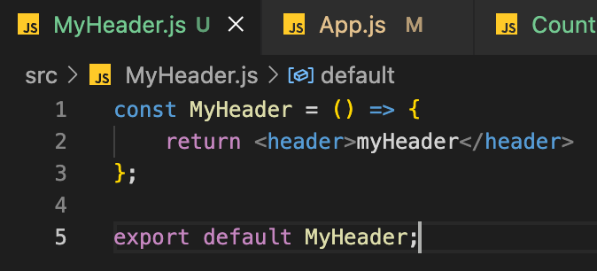 위 예시는 함수형 컴포넌트 MyHeader를 생성, App.js에서 import 및 렌더링하여 사용한 예시이다.(App.js는 npm start시 index.js에서 root태그 아래에 렌더링하여 사용하는 컴포넌트)
